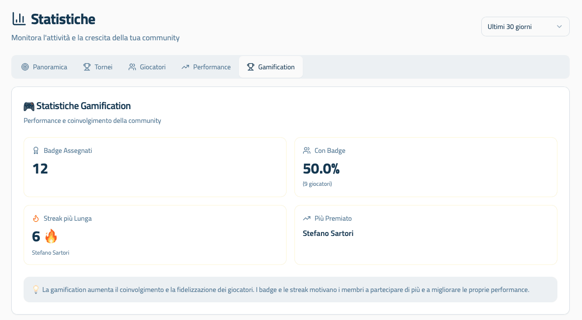 Ogni torneo genera dati utili: partecipazione, risultati, frequenza di gioco e ranking medio.